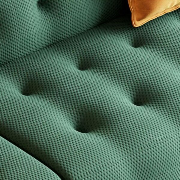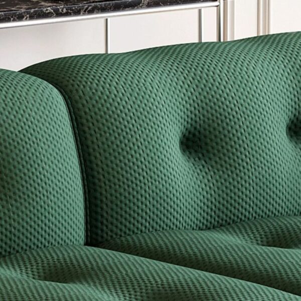 This sofa features a luxurious modern design with a bold deep green textured fabric. The upholstery has a soft, waffle-knit pattern that adds depth, style, and exceptional comfort. The sofa includes deep tufted cushioning across the seat, back, and ottoman, creating a plush, cloud-like feel.